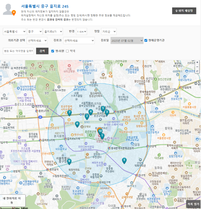 보다 직관적으로 찾고 싶다면 "지도 검색"을 활용해보세요. ‘내 위치로 이동’ 버튼을 누르면 GPS를 기반으로 주변 병원 및 약국이 지도상에 표시되어 빠르게 확인이 가능합니다. 여행지, 타 지역 방문 중에도 매우 유용한 기능입니다.